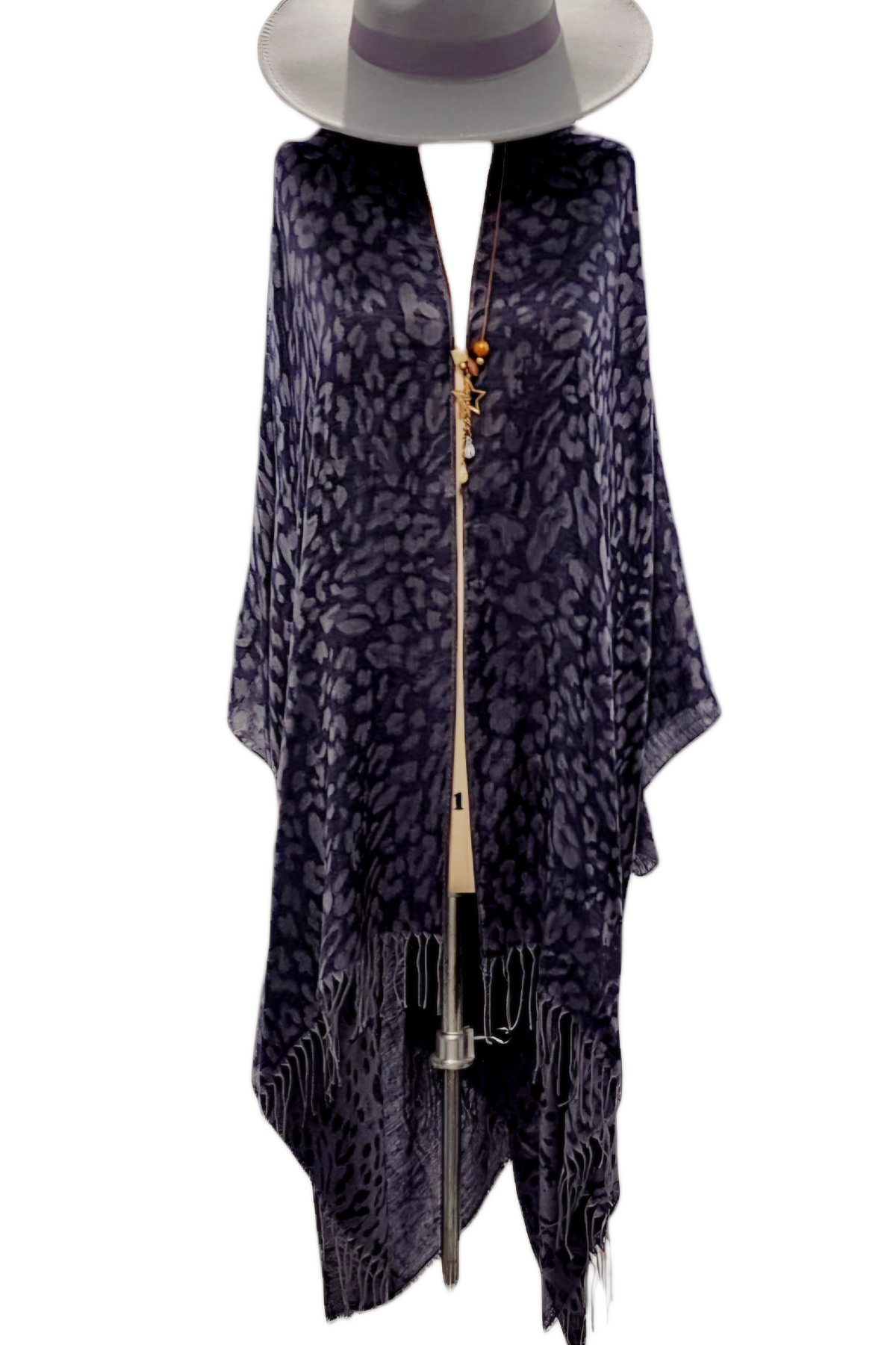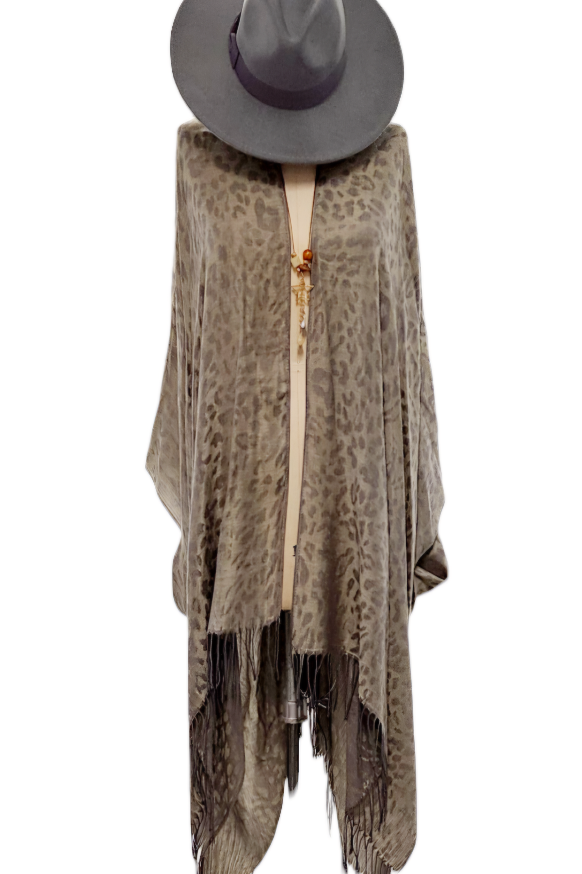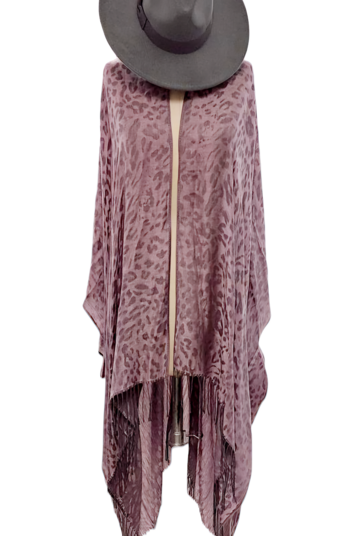 Viscose blend leopard fall medium weight kimono features fringe hemline and a luxurious drape.