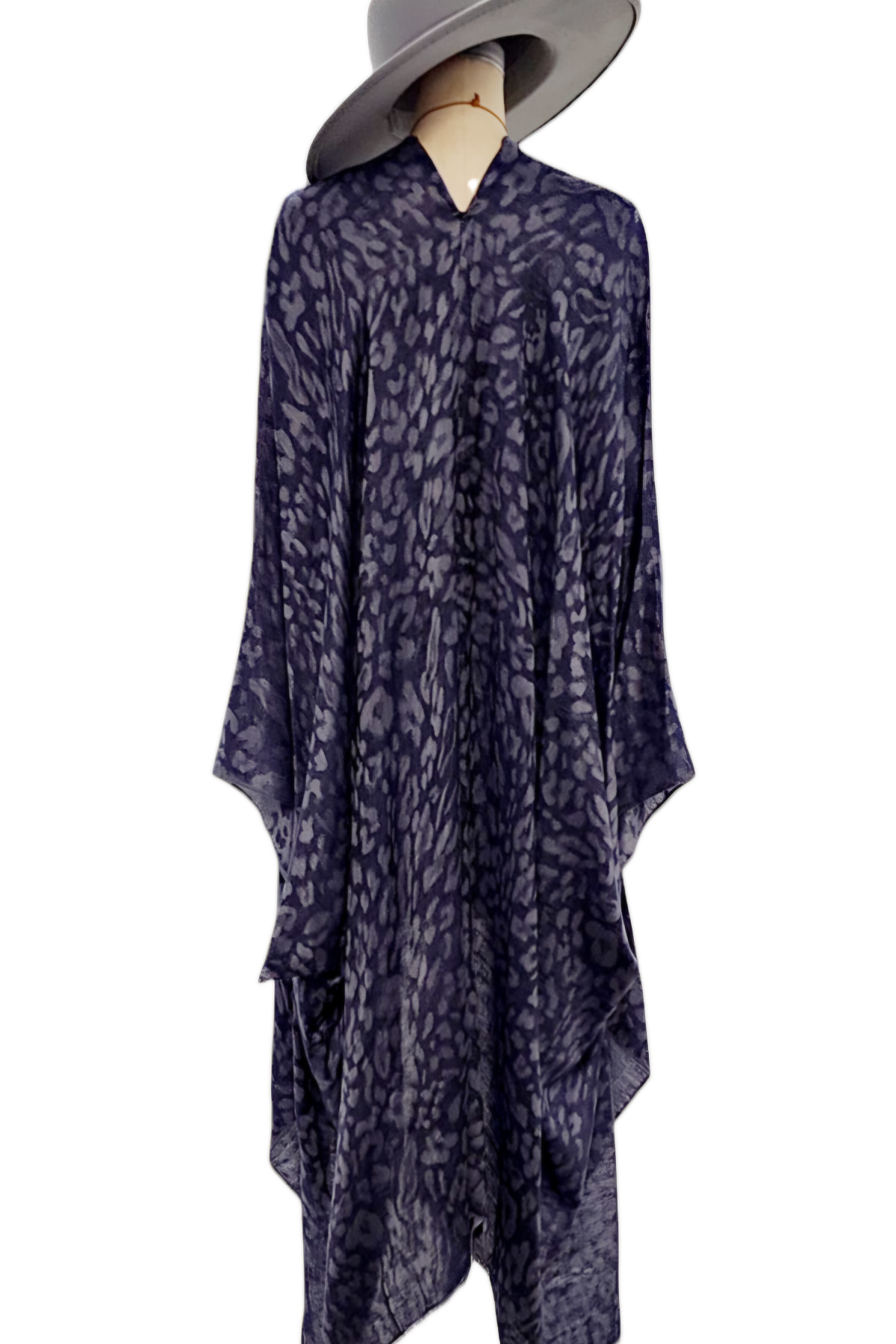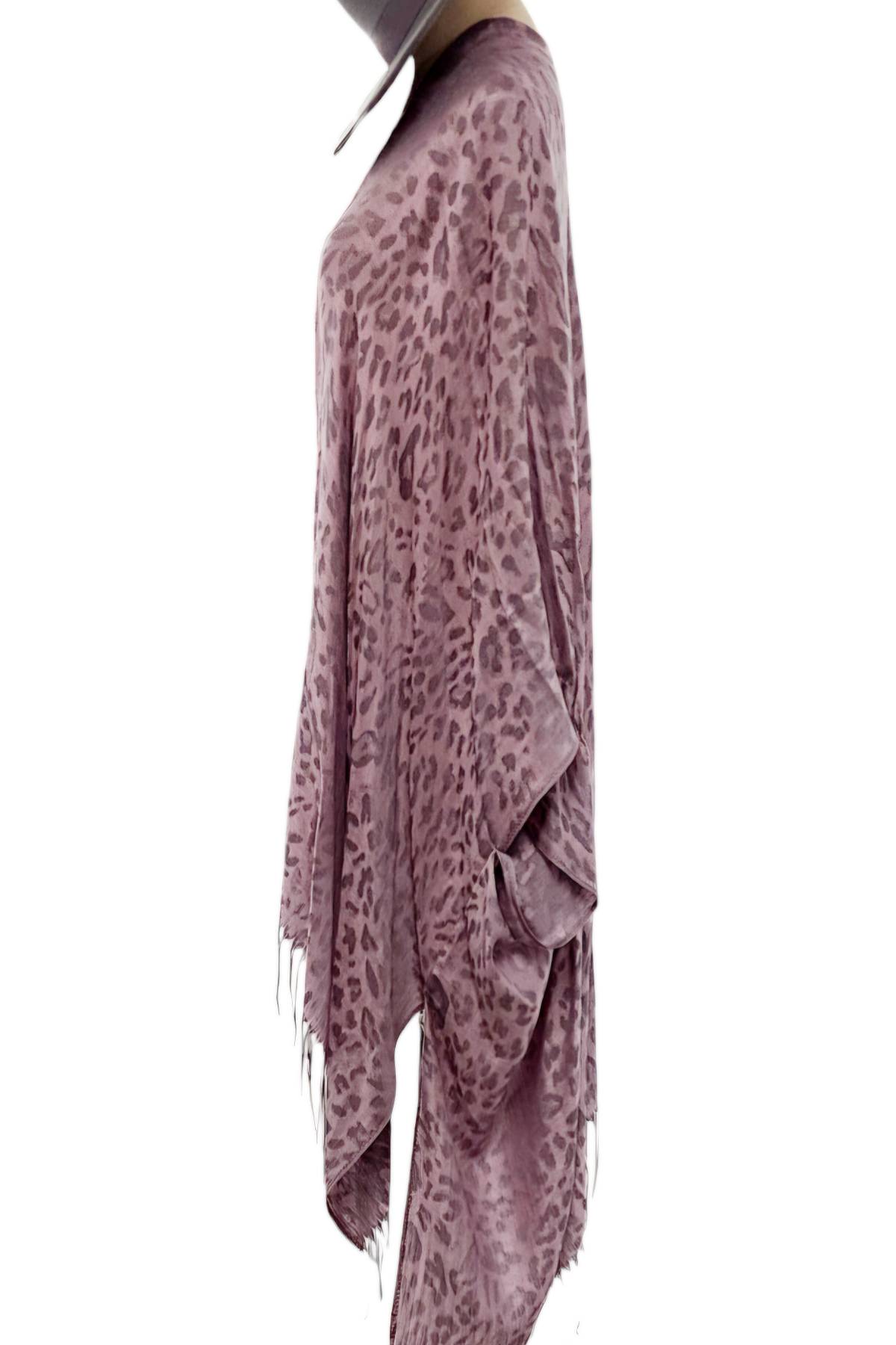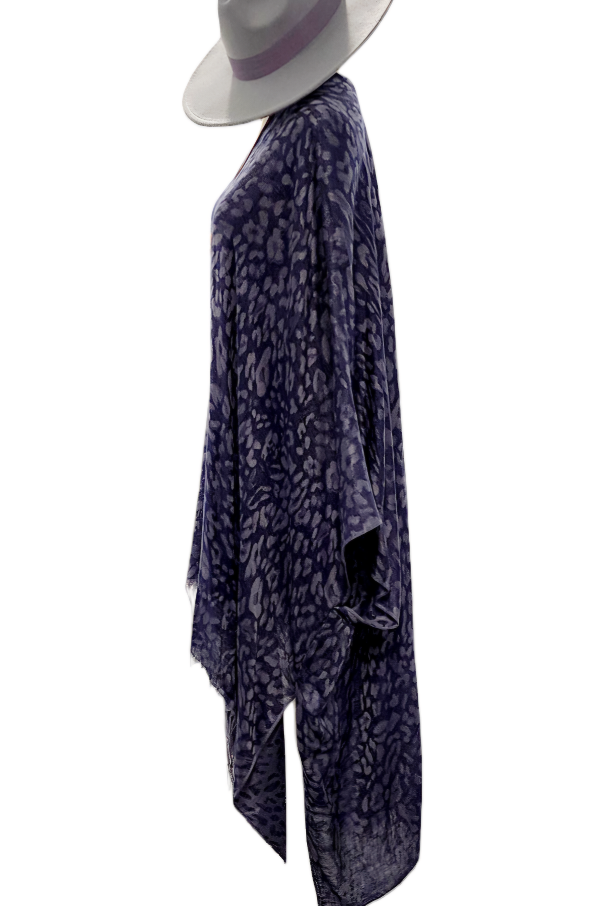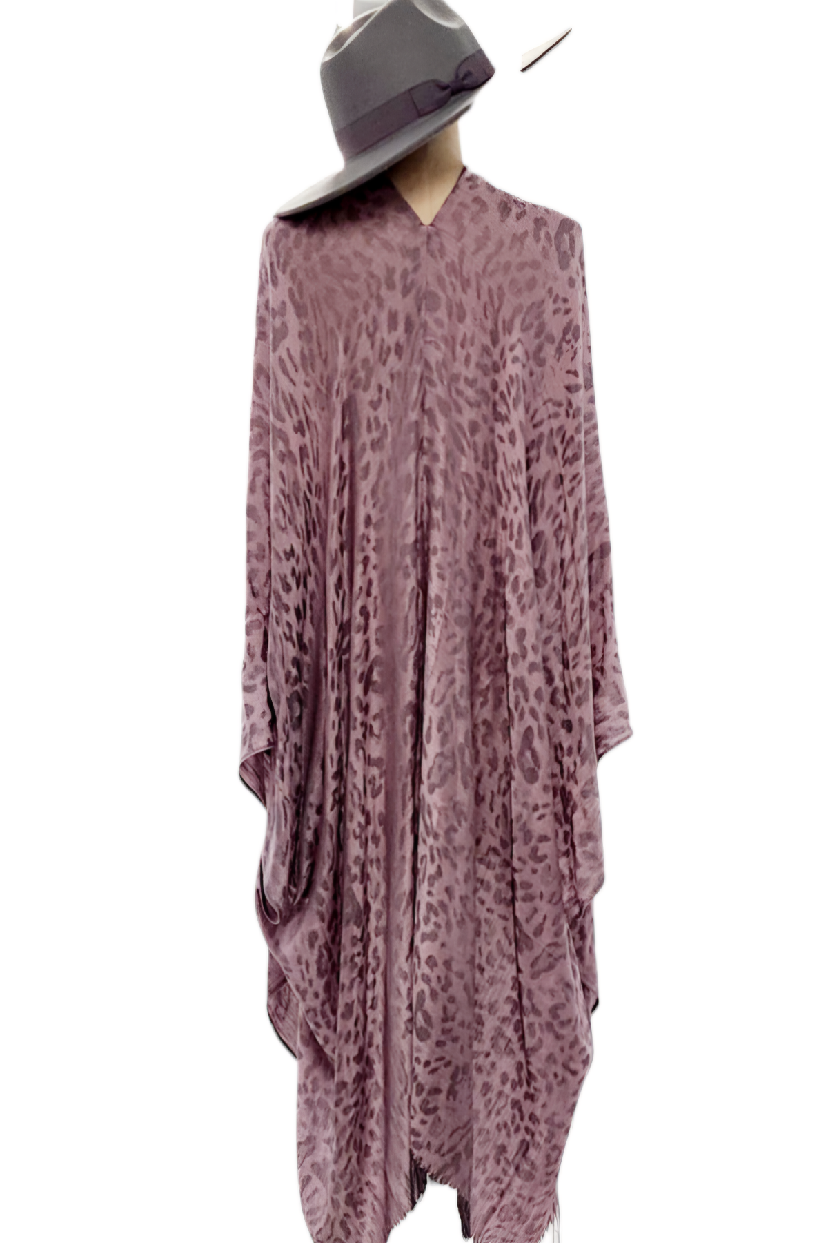 Viscose blend leopard fall medium weight kimono features fringe hemline and a luxurious drape.