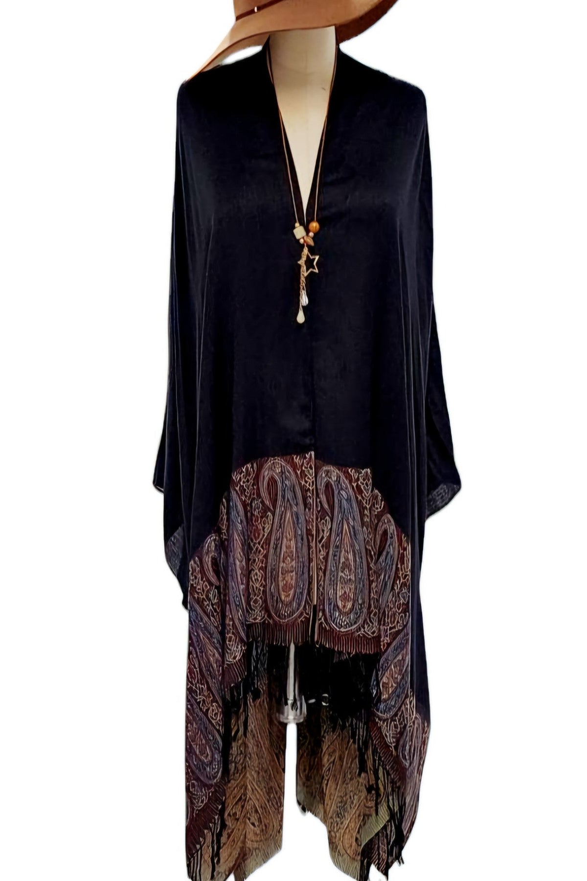 Our viscose kimono features a paisley trim, luxurious drape and can be paired with denim or leggings, or dressed up for a night out.